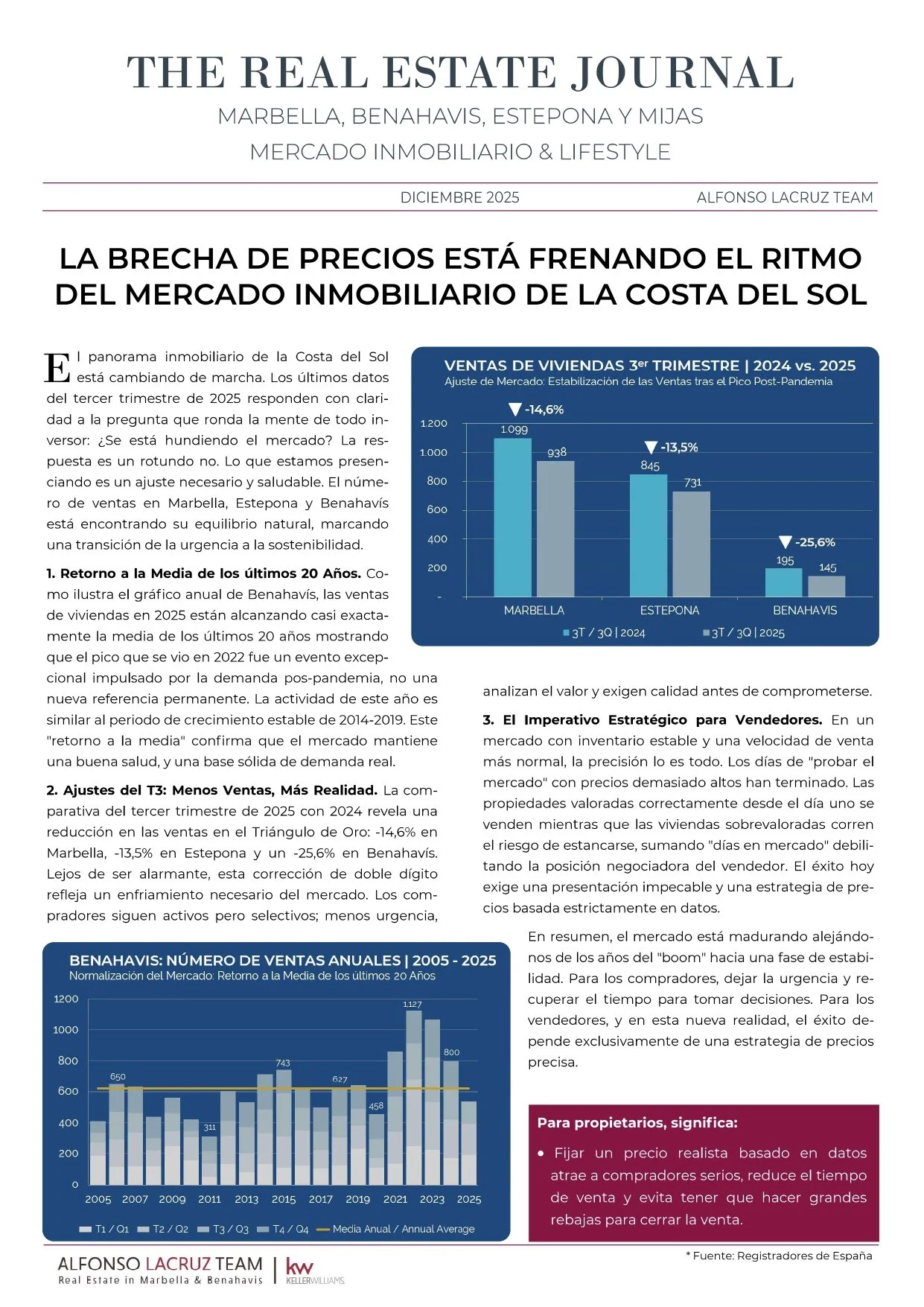 3. La solución: coherencia en el precio para proteger el valor. Para revertir esta tendencia, los vendedores deben apostar por la realidad del mercado desde el inicio. Un precio coherente atrae compradores serios, acorta los plazos y evita reducciones posteriores. En resumen, la demanda sigue siendo sólida y las perspectivas a largo plazo continúan siendo positivas, pero el éxito hoy depende de una estrategia de precio realista у alineada con el mercado, саpaz de cerrar con éxito la creciente brecha de negociación.