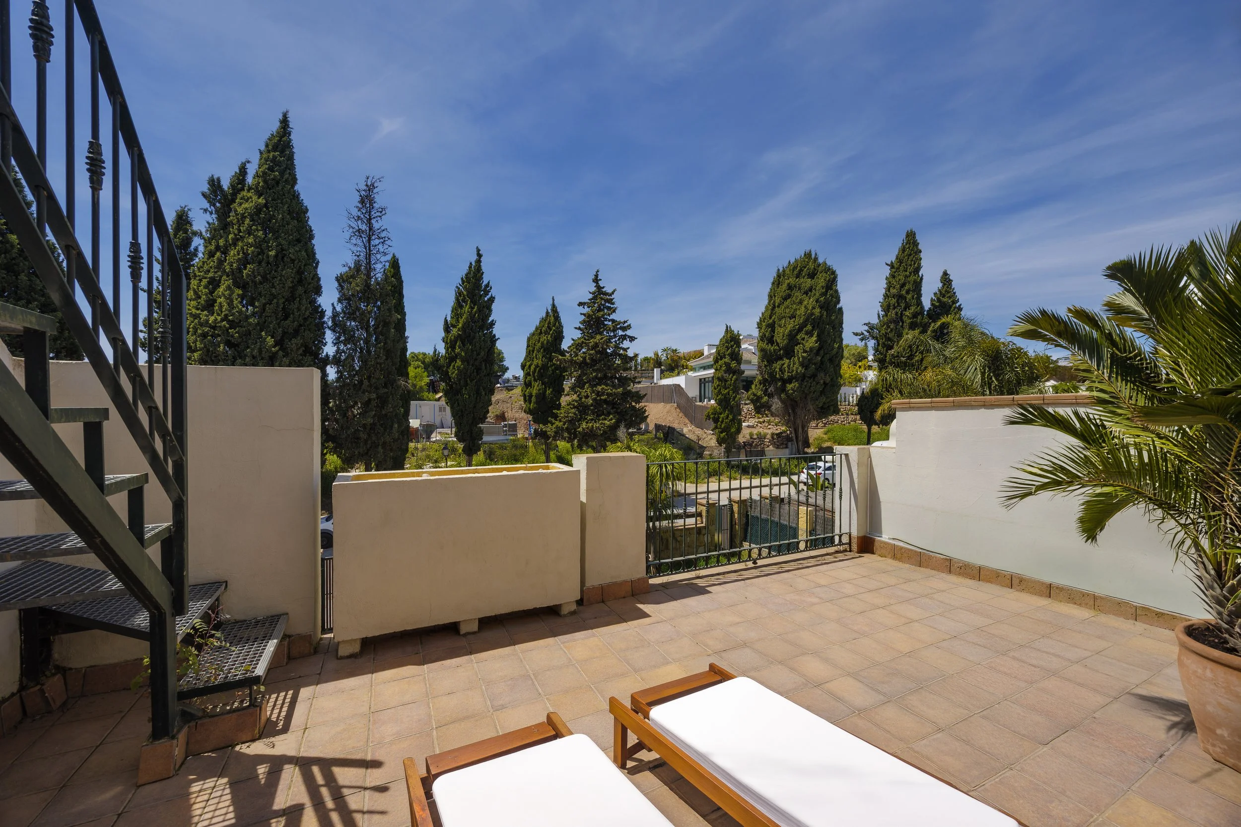 Upstairs is the sleeping area, comprising three spacious and bright bedrooms and two bathrooms. Two of the bedrooms benefit from recently renovated fitted wardrobes and pleasant views, while the main bedroom stands out for its generous size, en-suite bathroom, renovated private dressing area and direct access to a fantastic southwest-facing terrace.